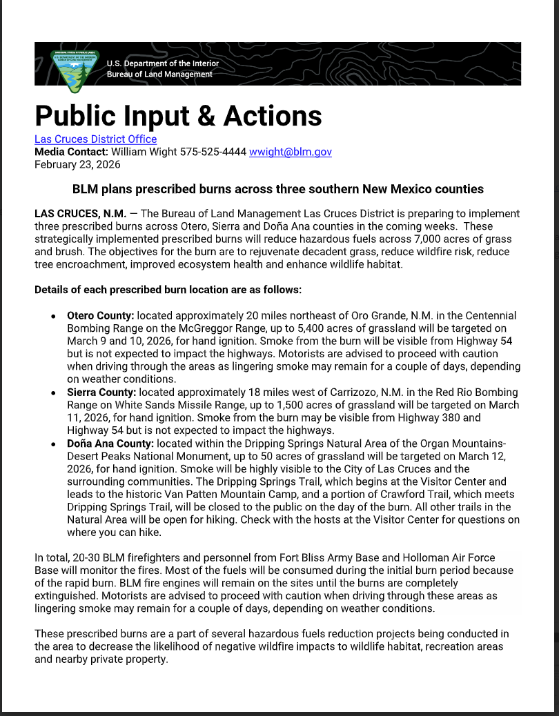 View Larger Image BLM plans prescribed burns across three southern New Mexico counties By sarah|2026-02-20T17:16:18+00:00February 20th, 2026|Uncategorized|0 Comments Share This Story, Choose Your Platform! FacebookTwitterRedditLinkedInTumblrPinterestVkEmail Related Posts